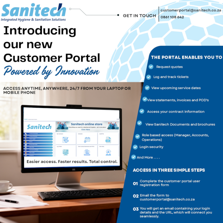 Introducing our new Customer Portal, powered by Innovation Access anytime, anywhere, 24/7. Download and complete the application form and email to customerportal@sanitech.co.za .